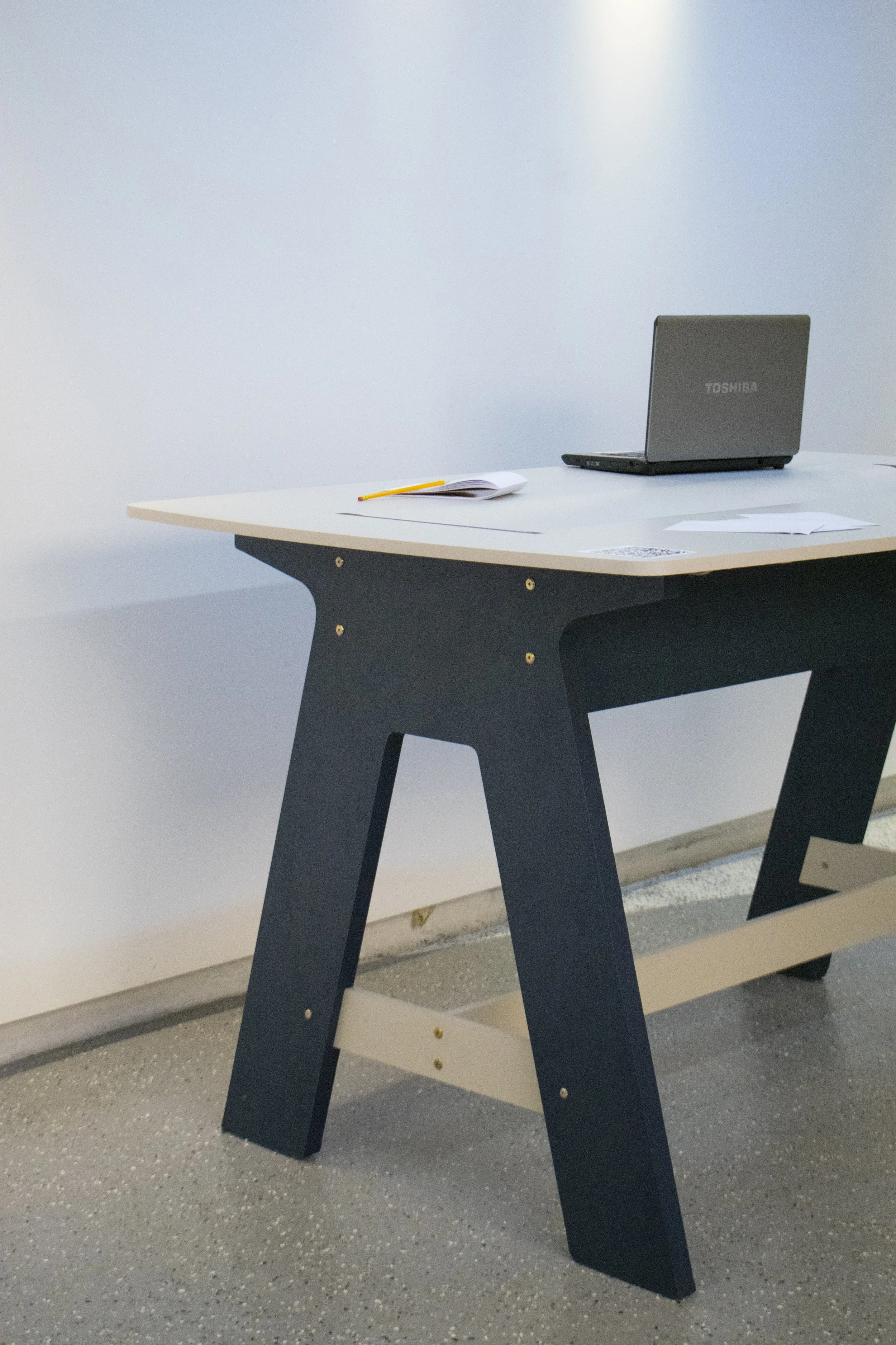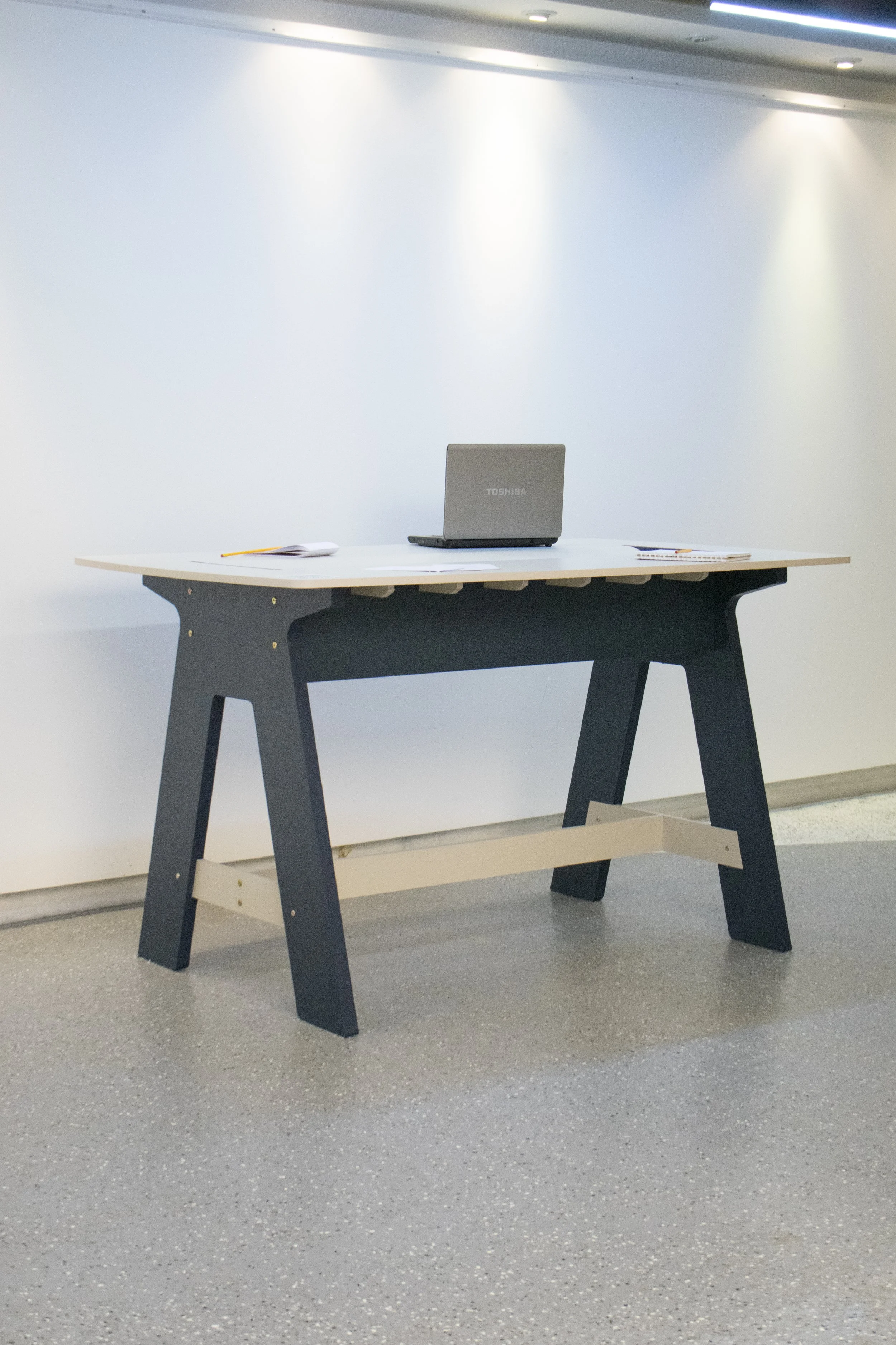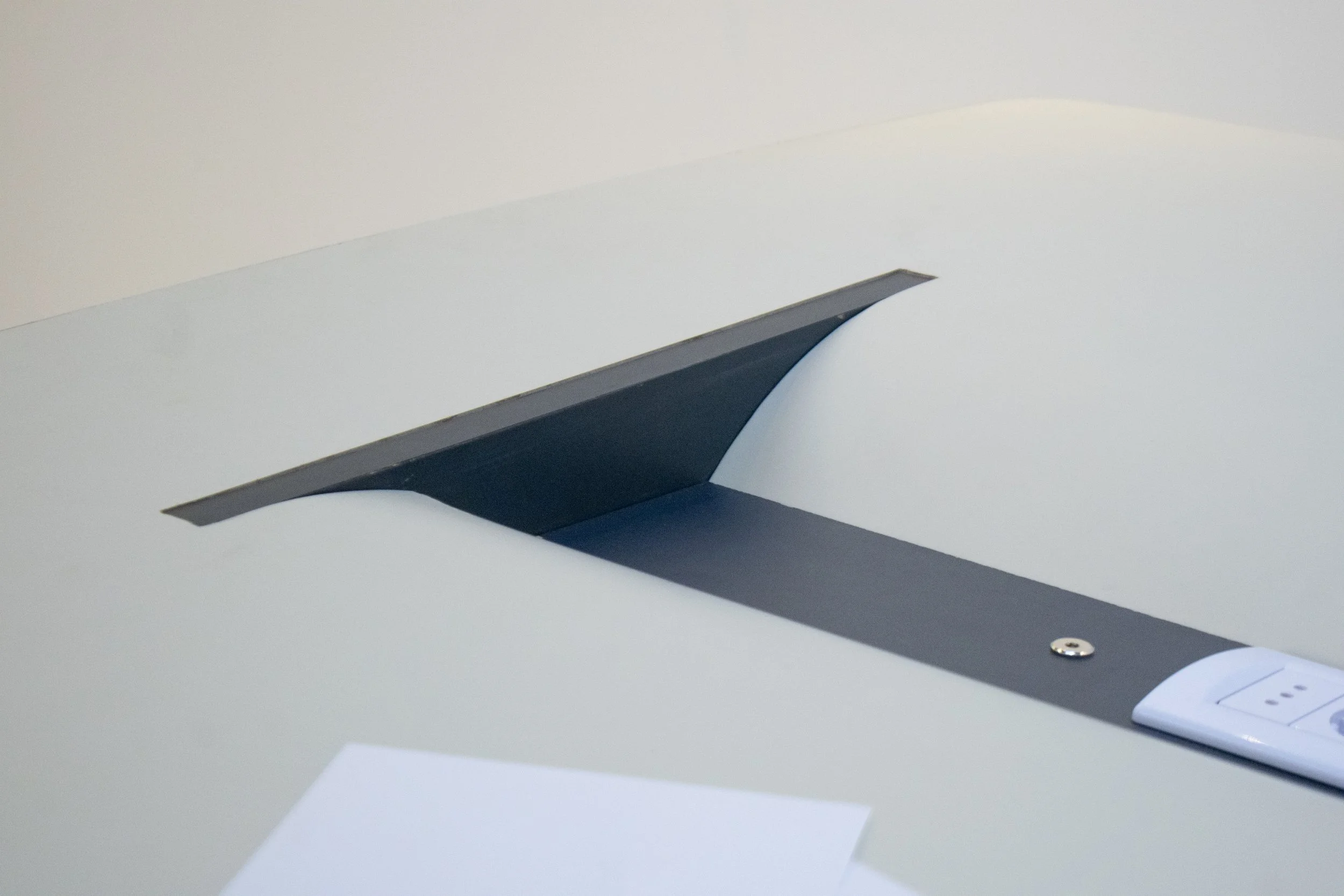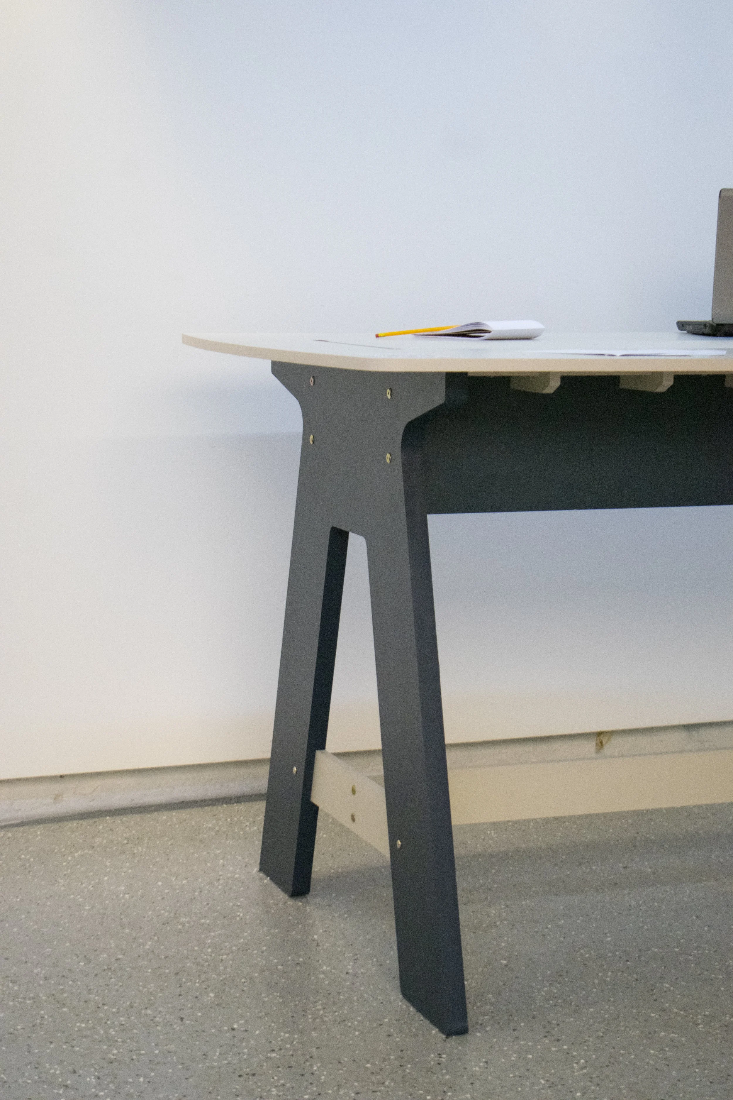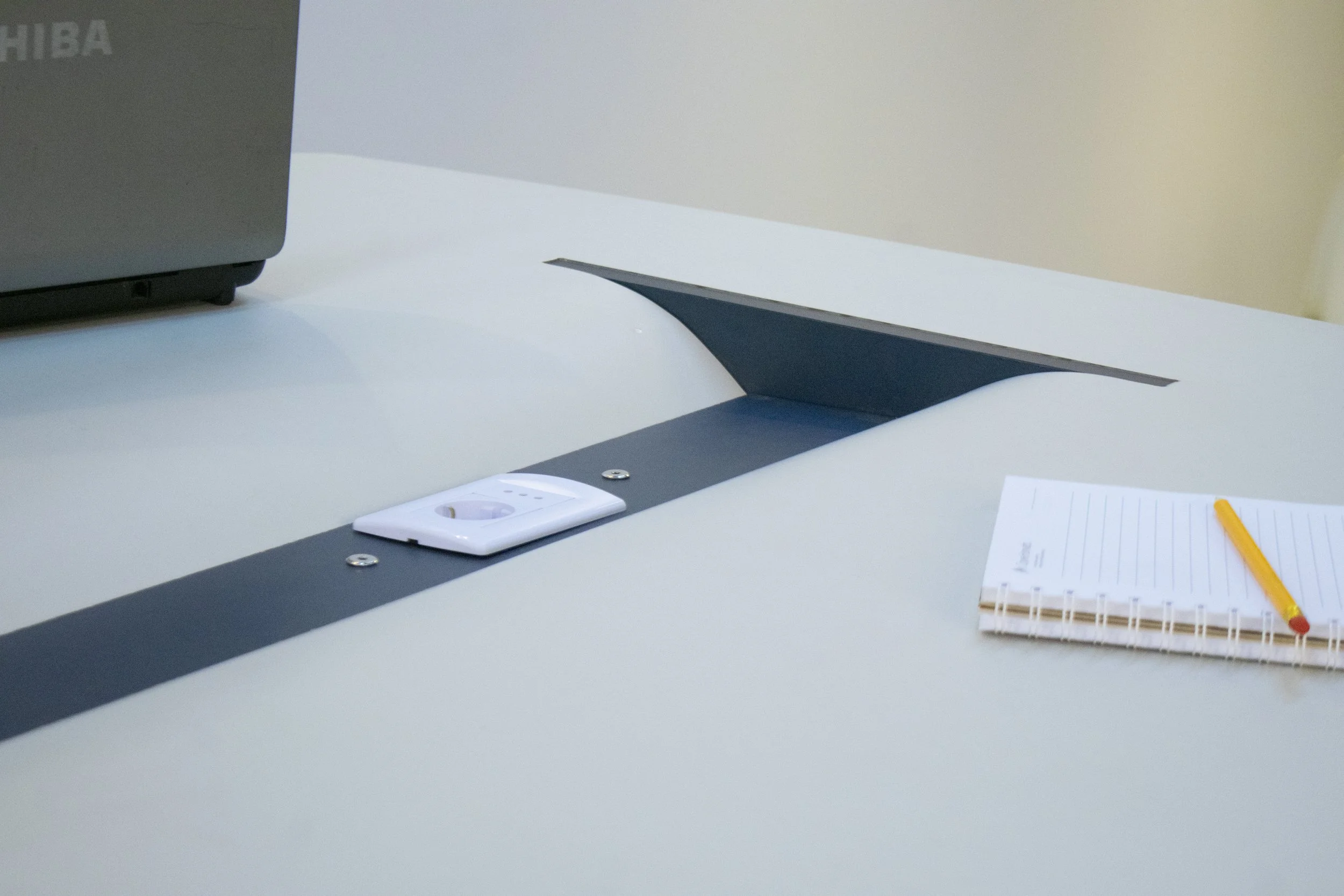 Por otro lado, el plano de apoyo principal llega al centro del escritorio curvándose mediante la técnica de kerfing, aportándole ligereza y carácter a la estructura, además de generar un espacio de almacenamiento con conexión 220v, al cual todos los usuarios pueden alcanzar de manera equitativa.